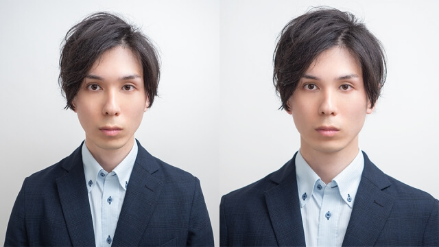 顎を少し引くと顔全体がシャープに見え、真っ直ぐ前を見て軽く微笑むと誠実さが際立ちます。